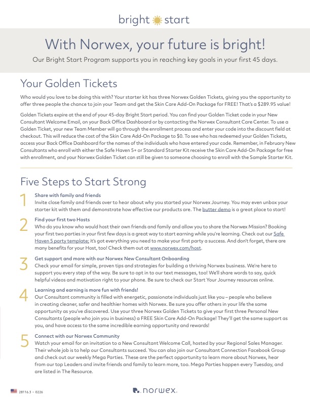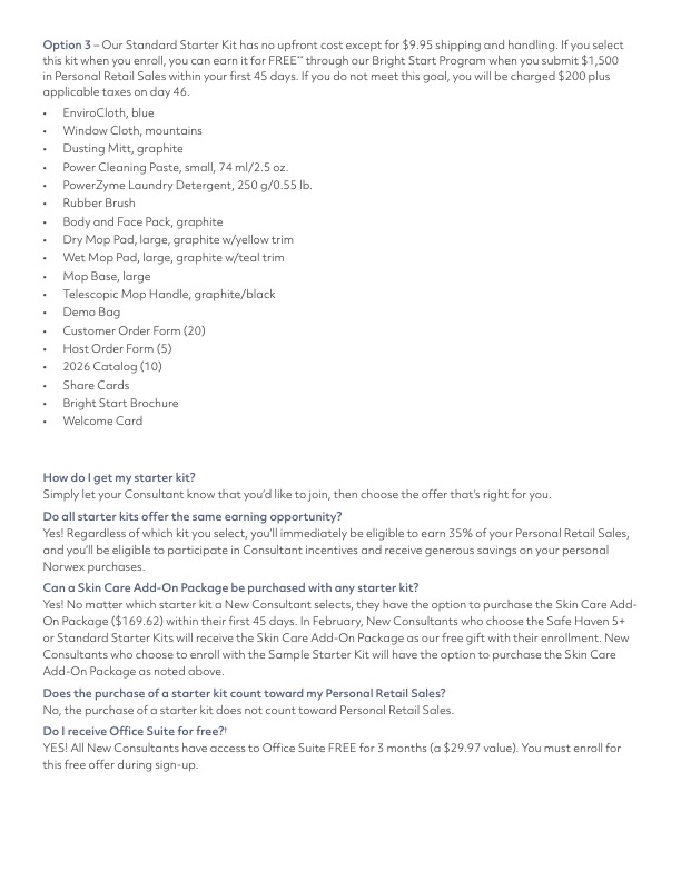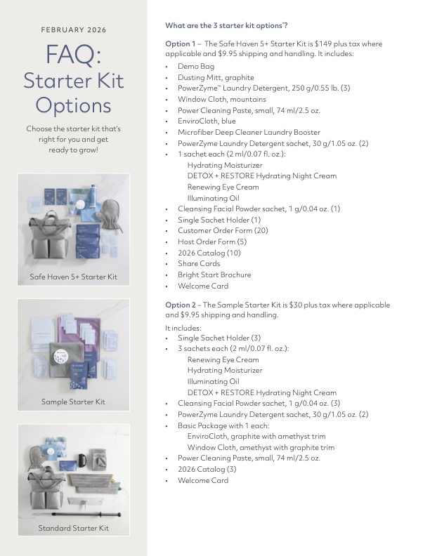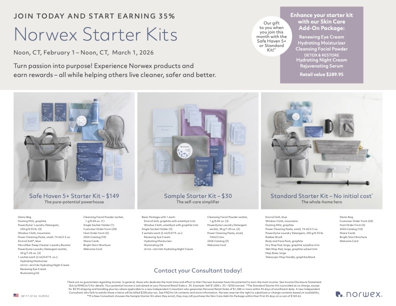 A. It’s really up to you! The Sample Starter and Safe Haven 5 are both great, low-risk option to try selling to family and friends. If you’d like to have the joy of unboxing new Norwex products now and earning them for free by selling $1500 in 90 days, you may be interested in the Starter Kit.